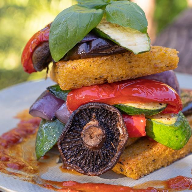 Once you have all your cooked components hot and ready you can build your stacks. Place polenta triangles onto plates, two or three for each person. Then assemble a selection of roasted veggies on top of the polenta in an artful way.