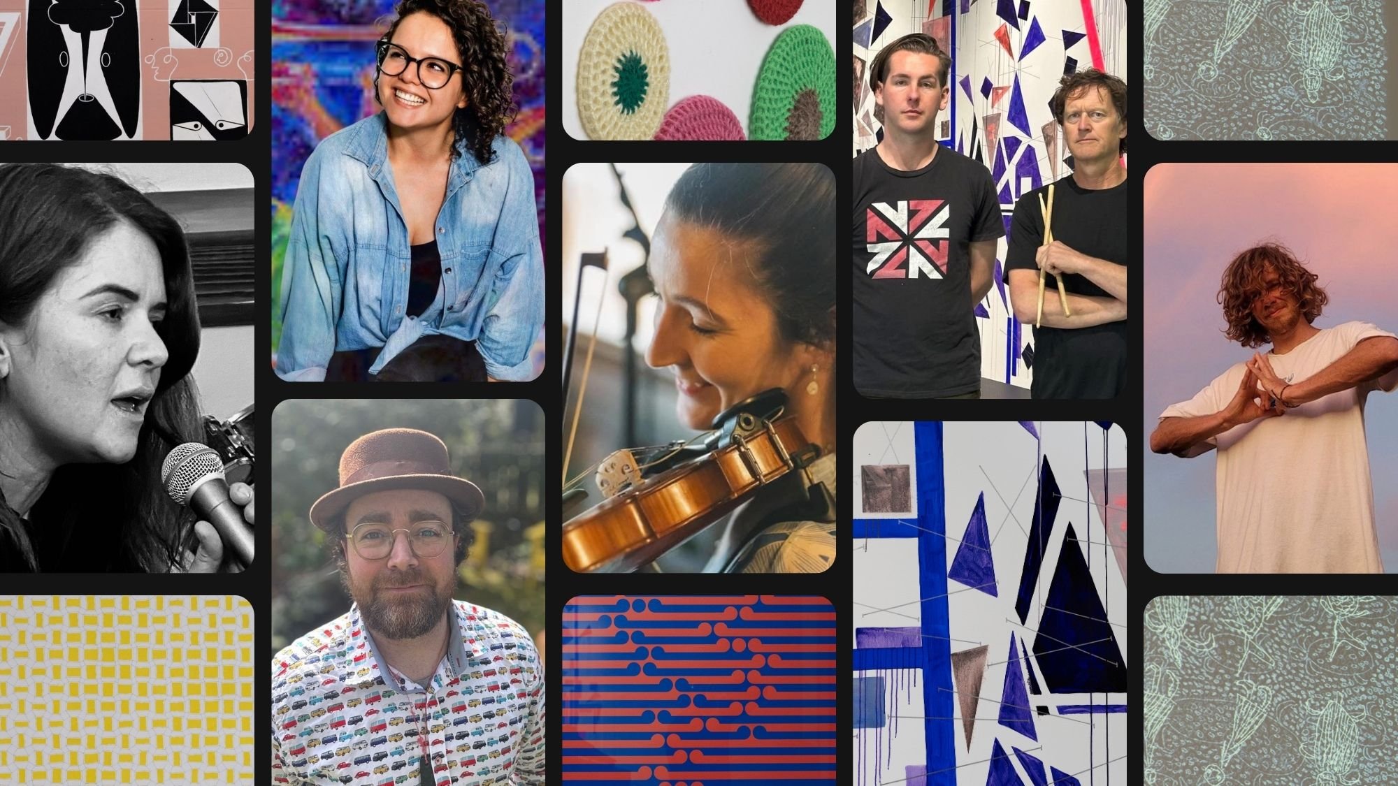 Henry Boyle, a trumpeter and digital composer with band Trekker Hotel, is matched with Nyapanyapa Yunupingu’s video installation; Erica Hastie (violin/fiddle) is paired with Ani O’Neill’s crochet installation; Chilean songstress Paulina Antoine Bustos with Julian Hooper’s canvas, and singer Teegs Stallard and pianist Mark Wilson are paired with Veronica Herber’s canvas.