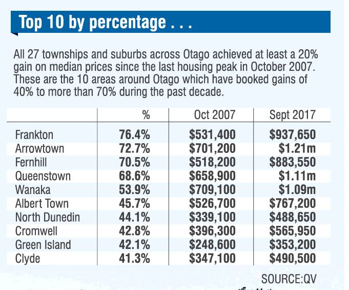 While Wanaka, Queenstown and its surrounding suburbs make up the top six of Otago’s 10 priciest areas, their gains during the past quarter have struggled to hit 1%.