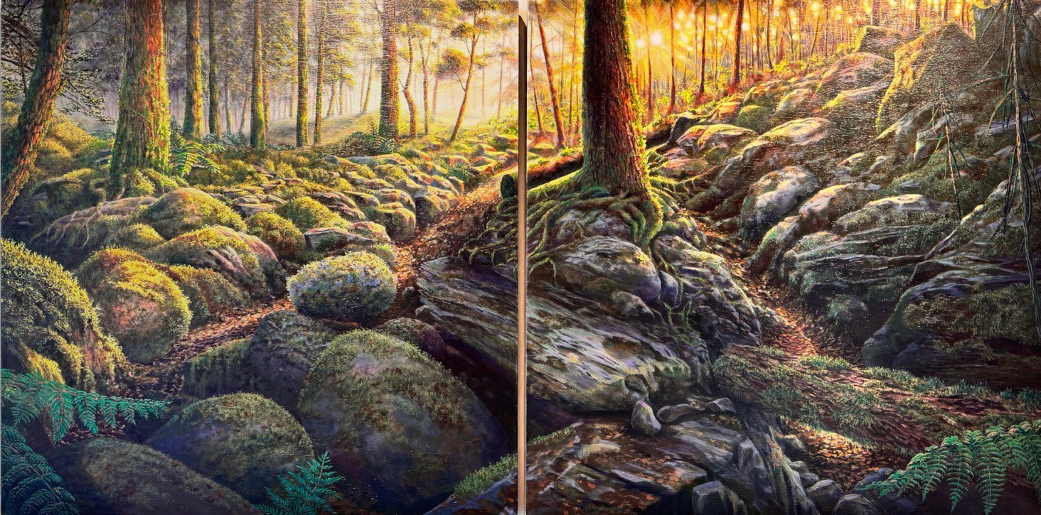 Burnished light filters through clustered tree branches, tracing a serene path along mossy rocks, and illuminating the forest with gentle warmth. Painter Sarah Freiburger is a master at exploring the transformative qualities of light, and her diptych Evening Light is glorious. Spilling across the two boards, the woodland scene has the charm and grandeur of a storybook setting, yet the tiniest mundane details ground the work with illusive photorealism. Freiburger is always extremely adept at focusing on the small details to enhance the image in its entirety. The whole tone of a scene can change with the shifting of shadow, objects can appear to change shape, and as the viewer moves closer or farther away, previously overlooked features emerge from the background.