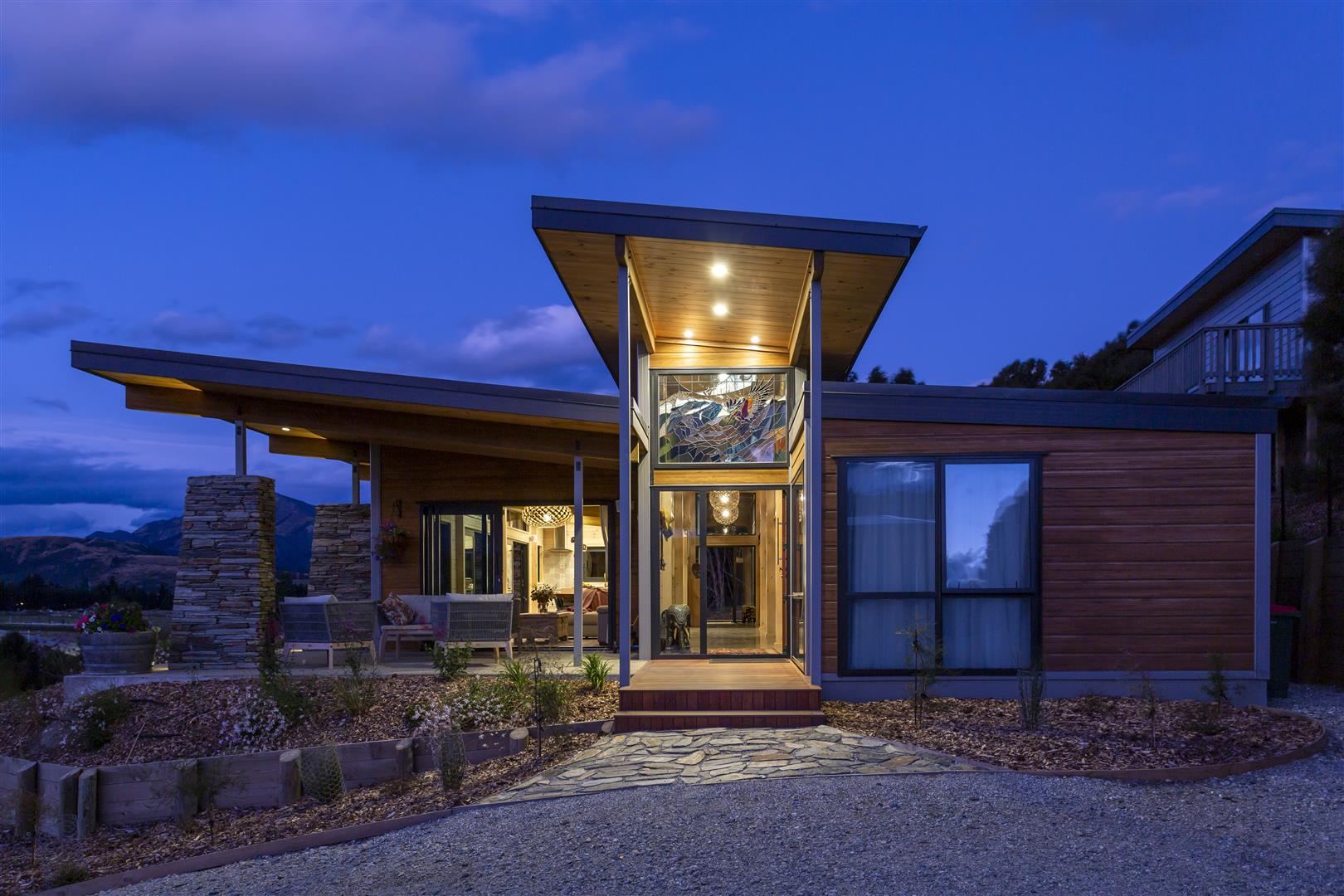 They also supported Wanaka based industry, purchasing sustainably sourced redwood tabletops, serving bench, and bench seats through a local timber craftsman. The schist for the pillars came from Cluden Stone Quarry and the incredible stained glass window commissioned from local leadlight artist Jennifer Robertson.