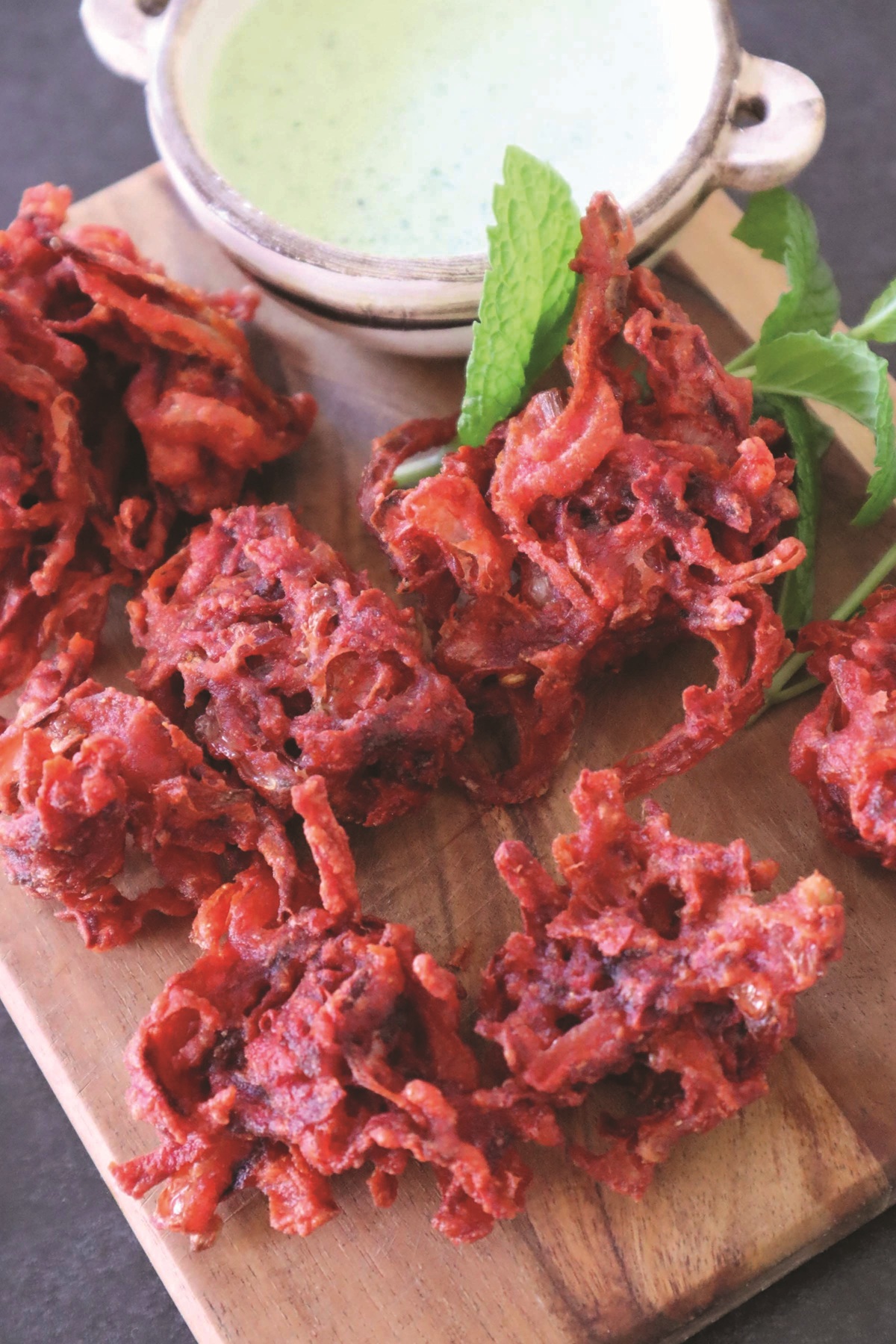 To make the pakoras, place the beetroot and onion into a bowl. Sprinkle the salt over and then by hand gently massage the mixture together. Set aside for 10-30 minutes, then drain off any juice that forms.