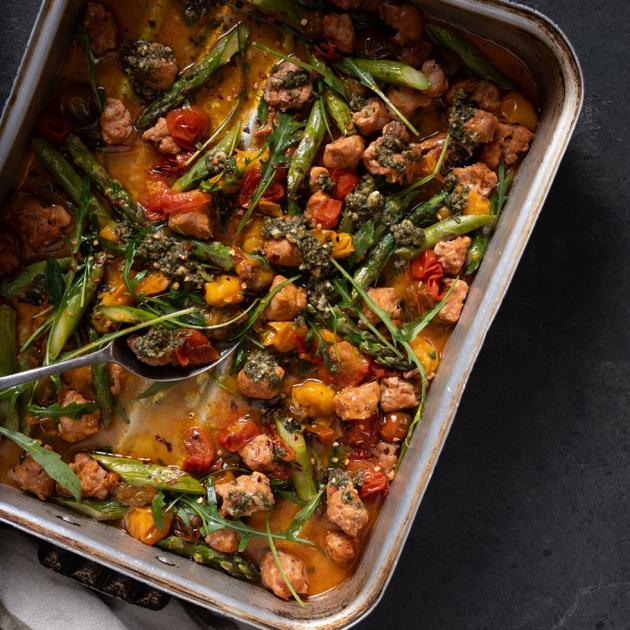 Roasted chorizo, cherry tomato and asparagus tray bake with pesto
