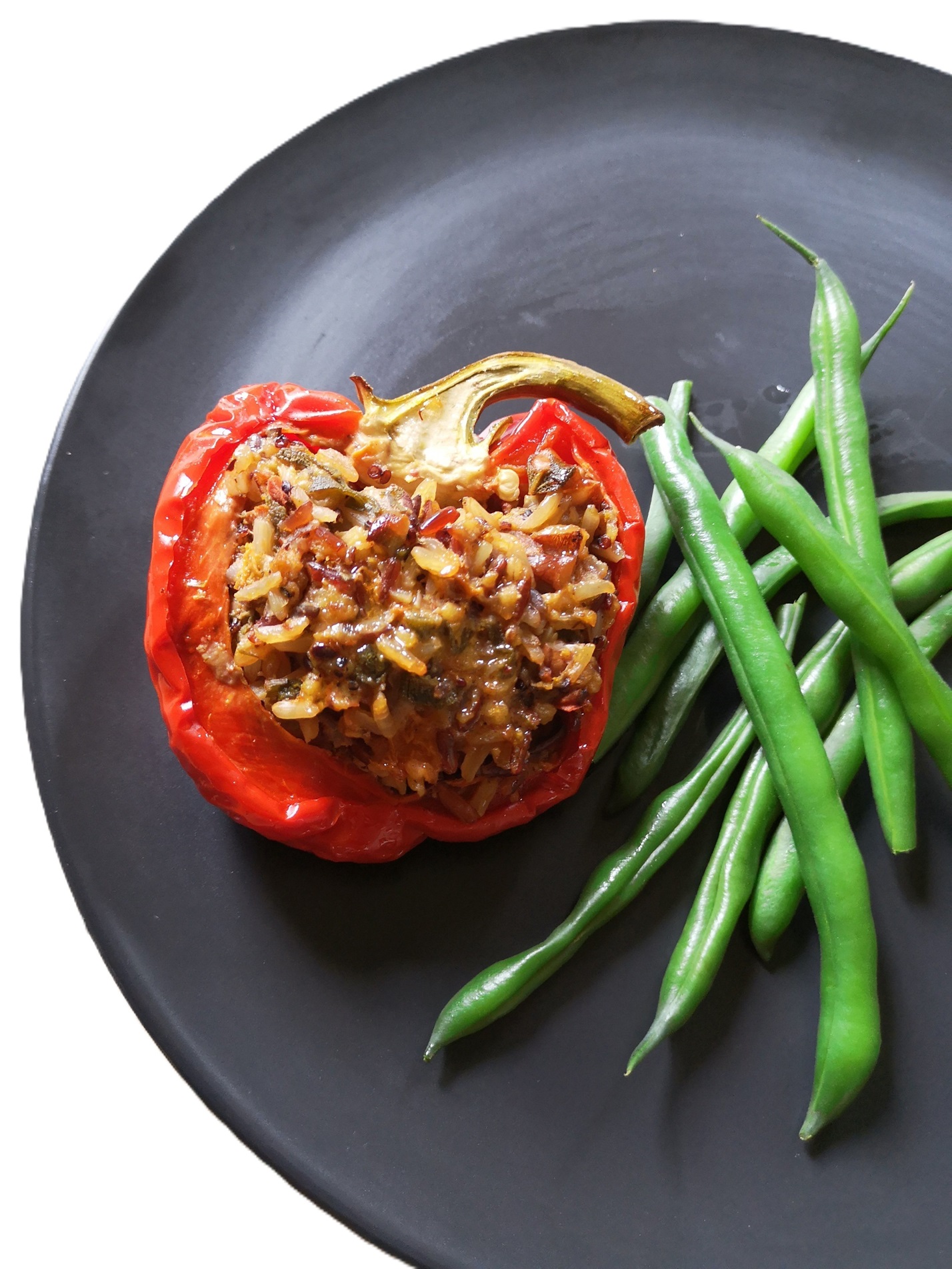 Stuff the mixture into the pepper halves. Place in a baking dish, cover with foil and bake for 30 minutes until capsicums are soft but not falling apart. Remove foil and cook another 5-10 minutes to brown the tops. Serve with a side of greens or a mixed salad.