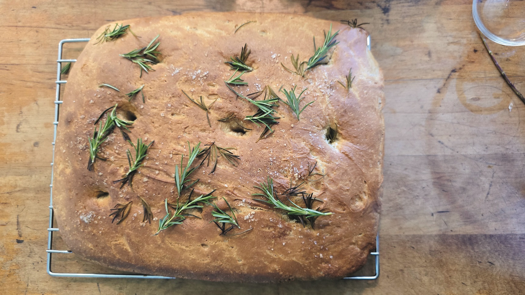 Vigorously shake the oil water mix in the jar so it emulsifies. You’ll know if the lid doesn’t seal well because you’ll flick it all over the kitchen! Tip the emulsion over the dough in the tray so it spreads over the entire surface and fills your finger holes. Finally, sprinkle the focaccia generously with rosemary leaves and flaky sea salt.