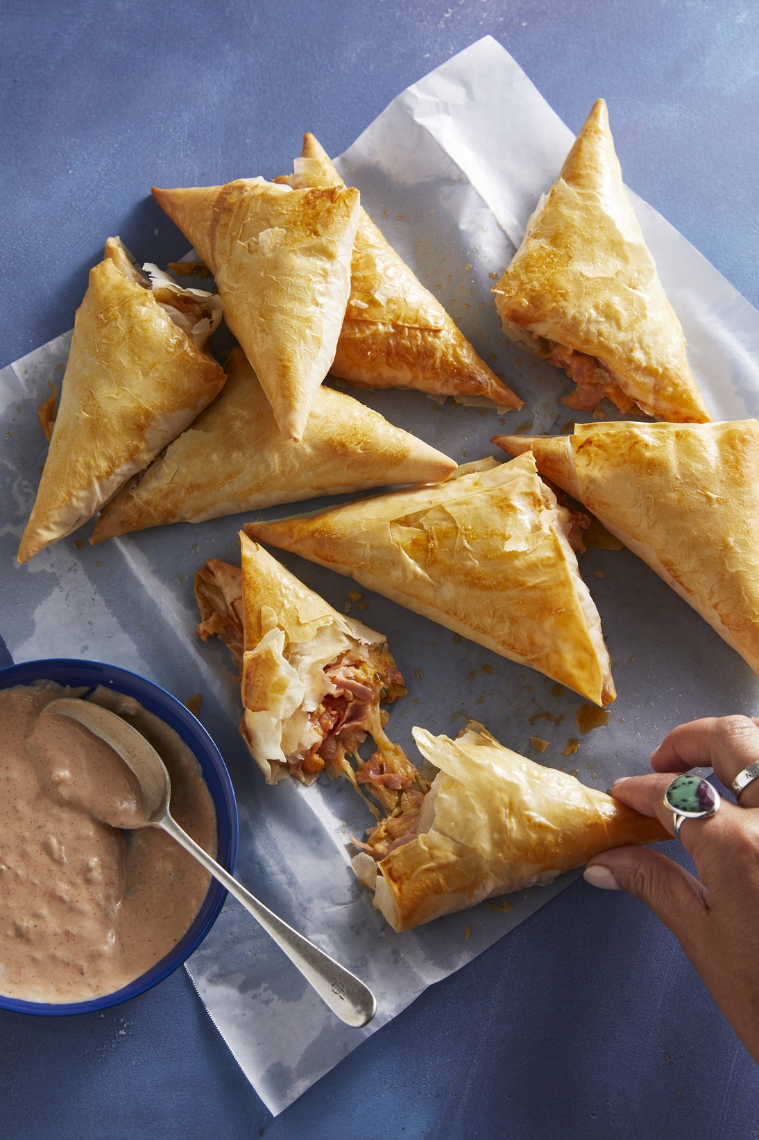 Place two sheets of filo pastry on a clean surface. Lightly brush with olive oil, then fold it in half lengthways. Place two spoonfuls of the filling mixture near the bottom corner. Fold the pastry over to form a triangle, then continue folding to maintain the triangular shape. Repeat with the remaining filo sheets, olive oil and filling to make eight triangles.