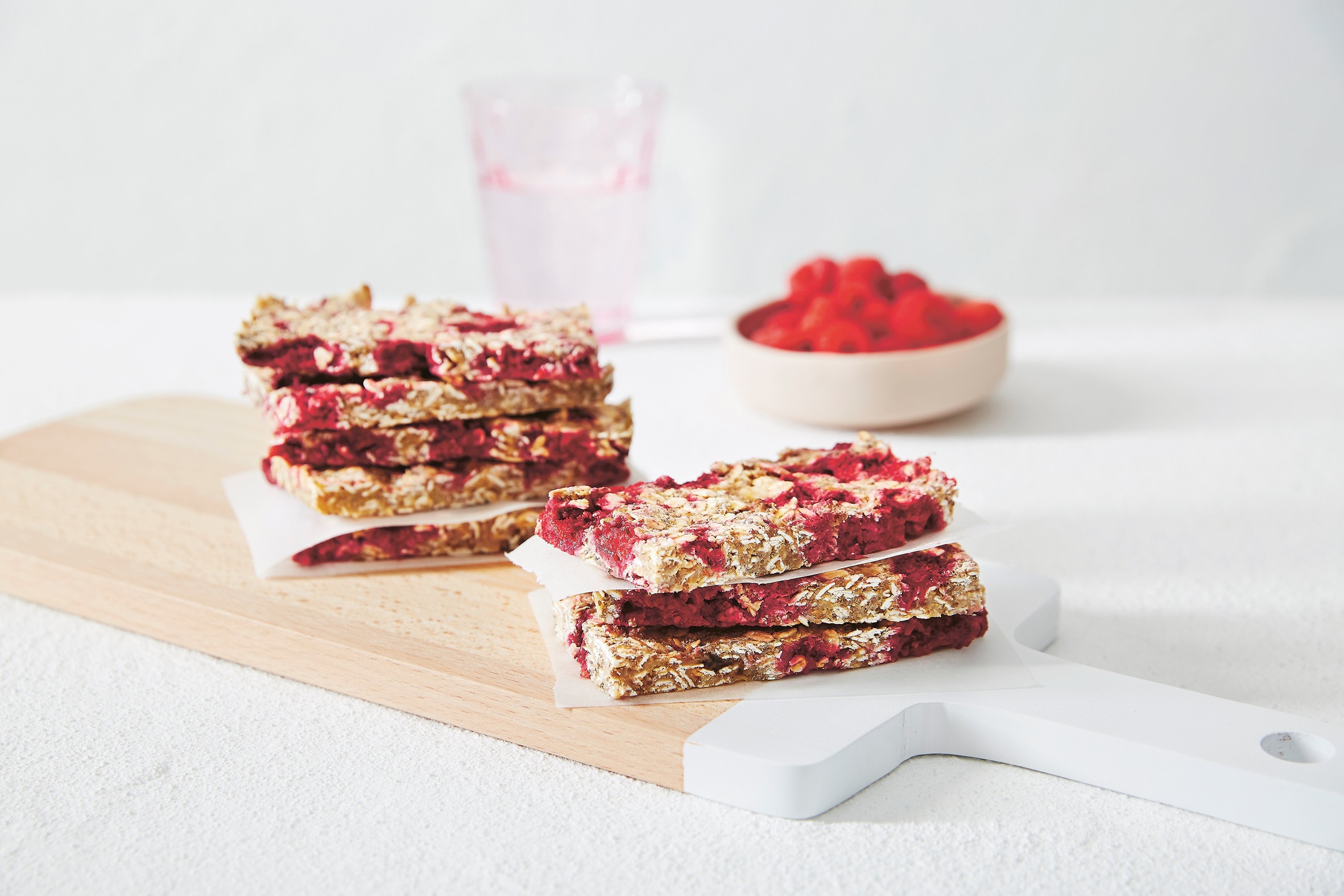 Preheat oven to 160°C . Line a square 20cm baking tin with baking paper. Combine the apple sauce, maple syrup, banana and vanilla in a bowl. Add the oats and chia seeds, and mix to combine. Gently fold through the raspberries and transfer the mixture to the prepared tin. Press down gently with the back of a spoon to even out and smooth the top. Bake for 20 minutes then cool completely on a wire rack before cutting into six bars.
