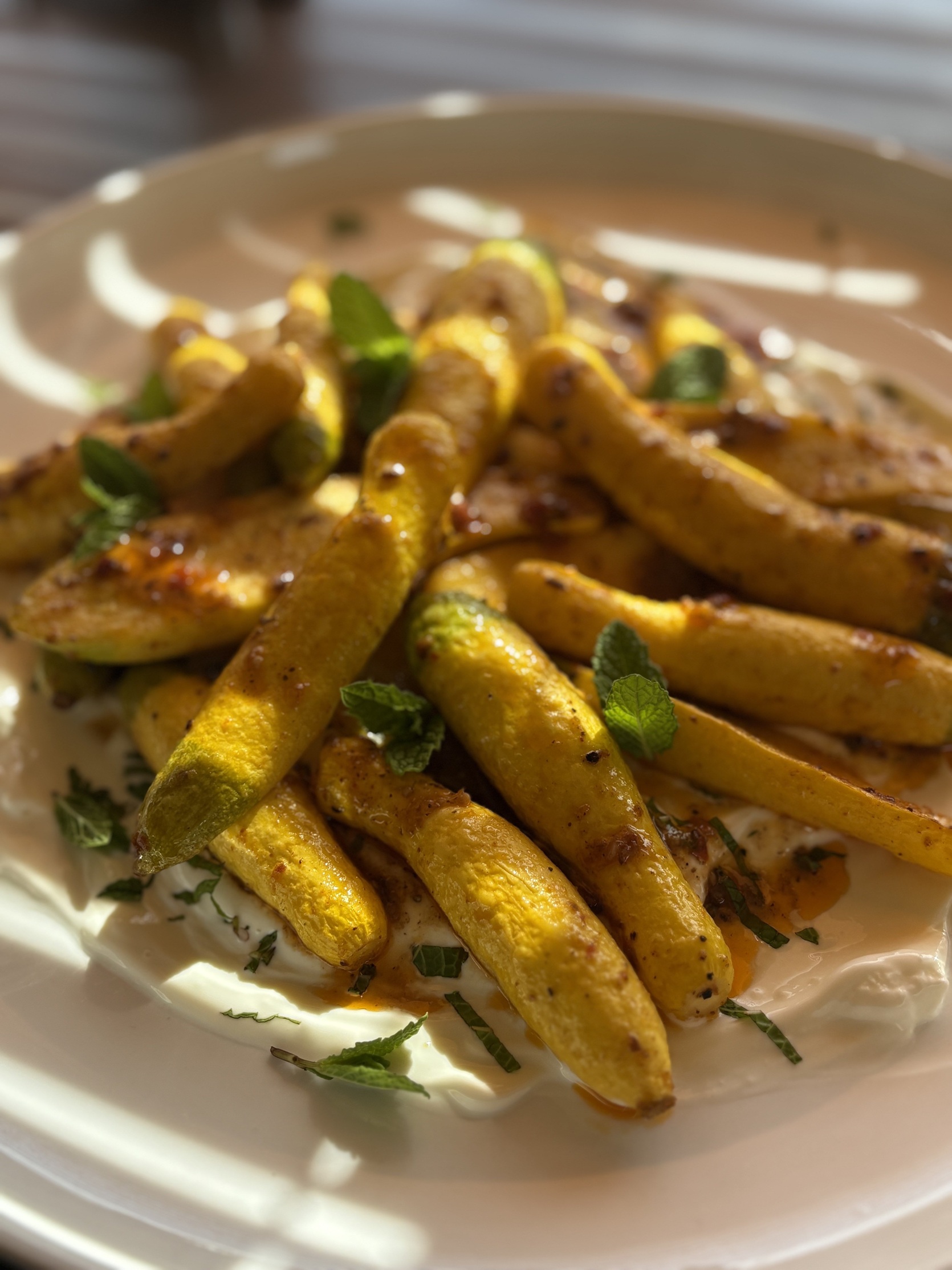 To serve spread the strained labneh, arrange the courgettes over the top then drizzle over brown butter and scatter the herbs.