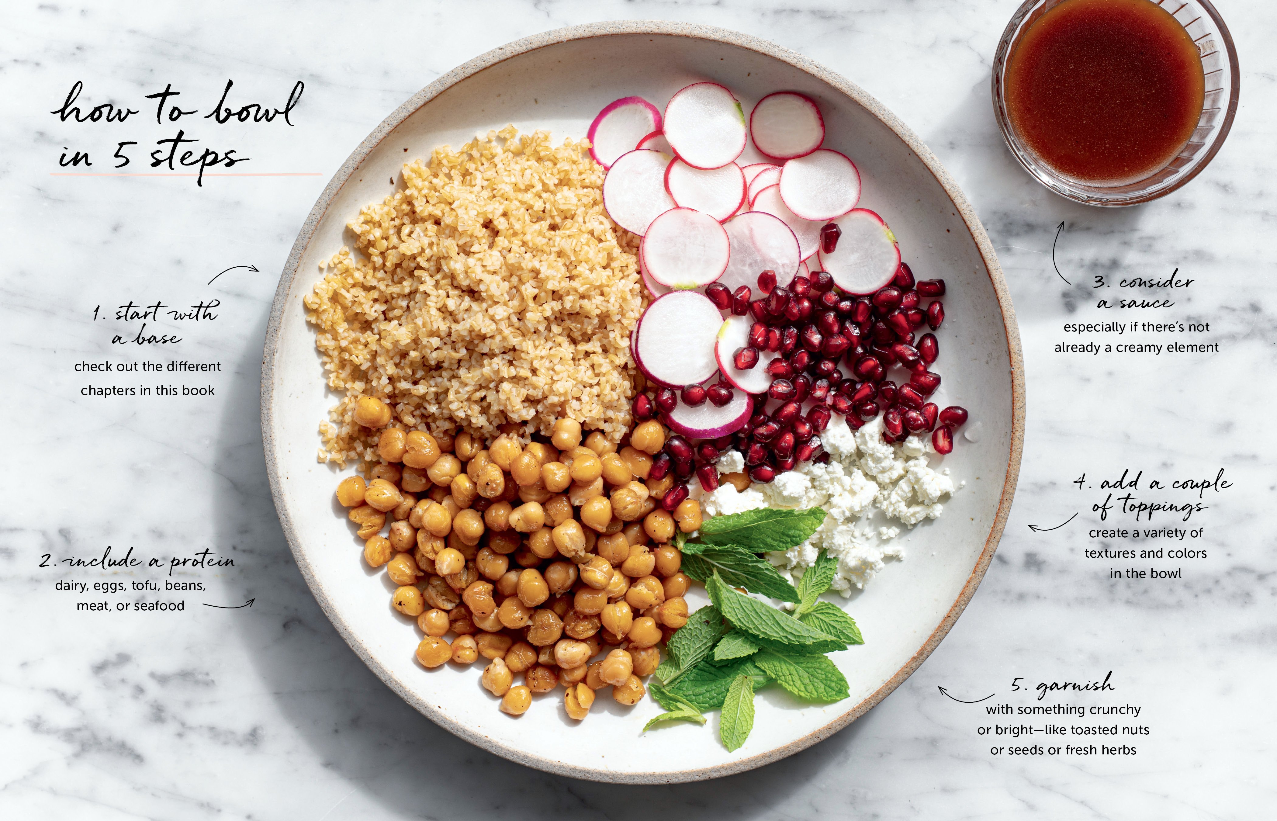 Last, the bowls in this book are often garnished with a crunchy or bright element. A finishing touch like toasted nuts or seeds looks beautiful and adds a little surprise.