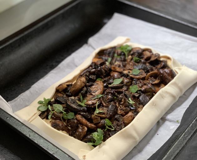 Place the thawed puff pastry squares next to each other and press two ends together so it forms a rectangle of pastry. Fold all four edges inwards 2cm to create a crust. Spread the cashew cheese, then lay the mushrooms on top. Top with extra fresh thyme.