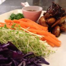 Thinly slice your carrot and cabbage. You can use whatever you have in your fridge really. Red capsicum adds a really good colour. Place all your vegetable fillings on a nice plate: presentation is key.