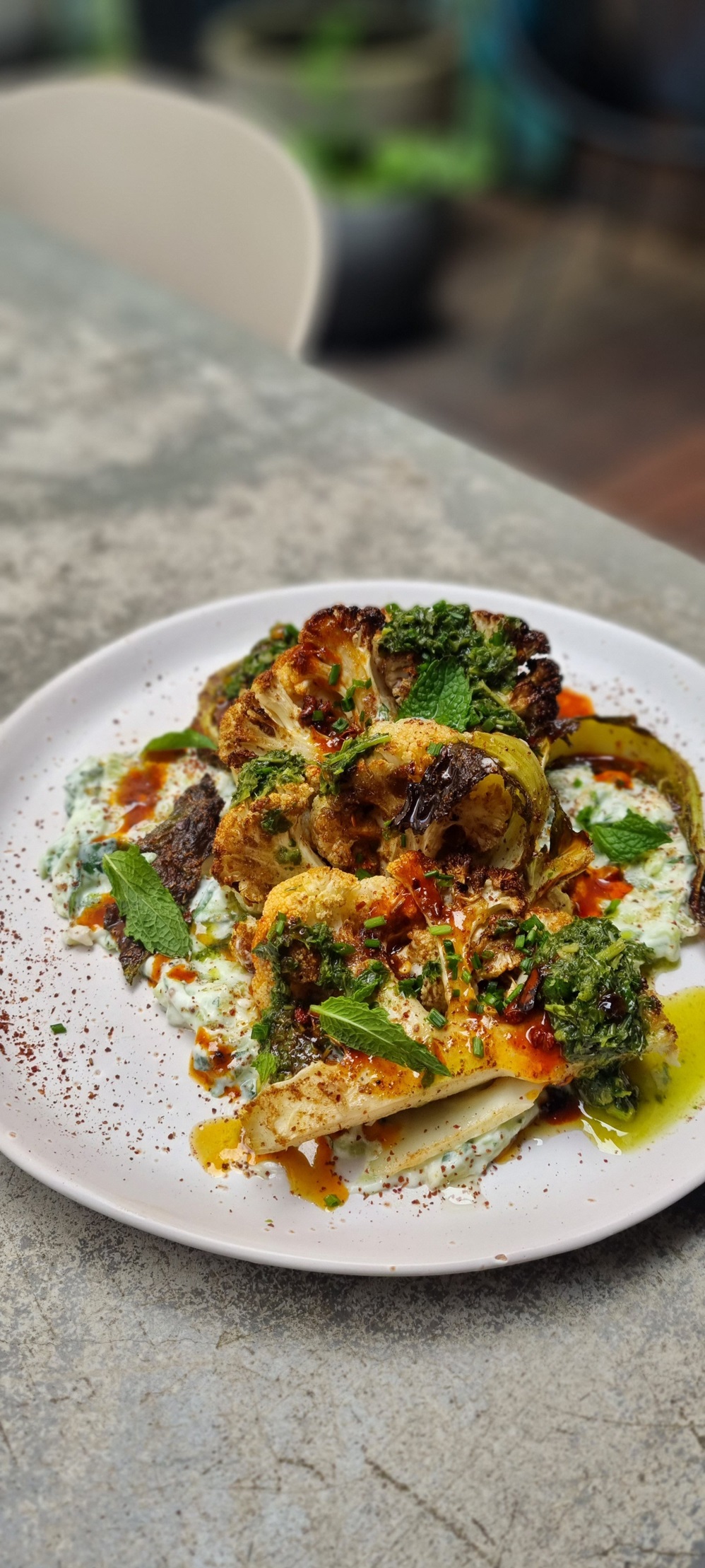 On a serving dish, spoon on your raita and cover to be the base of the dish, layer your roasted cauliflower across the dish and garnish with chilli oil and freshly chopped herbs. I also top the plate with a little extra sumac to give it that extra wee tangy kick.