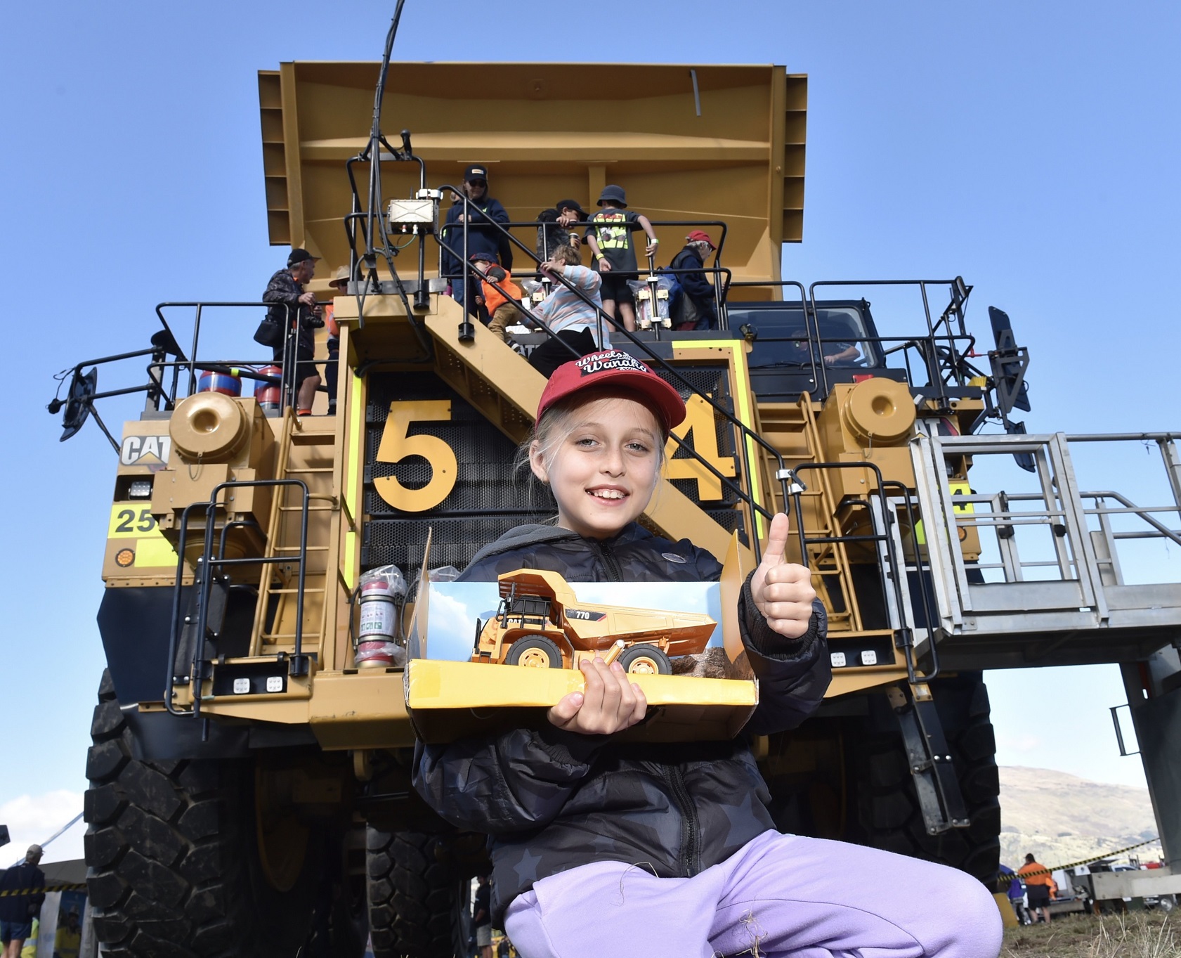 Wheels at Wanaka and Oceana Gold had their giant Caterpillar haul truck on display. As luck would have it, Caterpillar NZ had its display not far away too. That's where I found Thea and her new model of a similar haul truck, giving me the chance to illustrate the contrast in scale and the fun to be had.