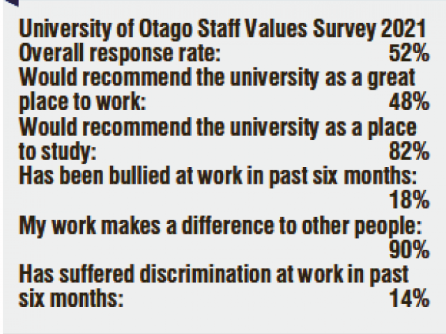 Fewer than half of its staff members would recommend the University of Otago as a great place to work, a survey has revealed.