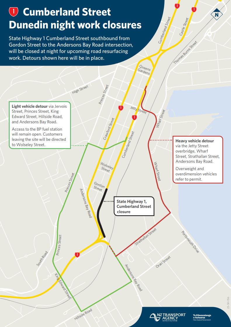 For heavy vehicles, it will be via the Jetty St overbridge, Wharf St, Strathallan St and Andersons Bay Rd.
