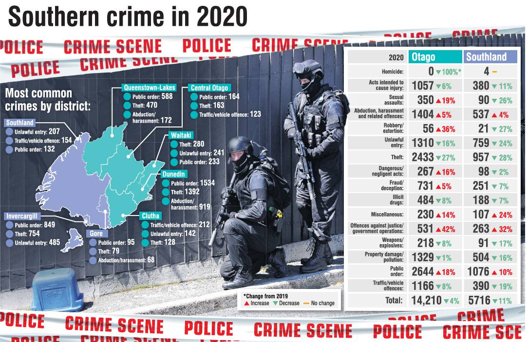 Police data shows decreases in thefts, drug crime, unlawful entry, traffic offences and acts intended to cause injury in both Otago and Southland last year.