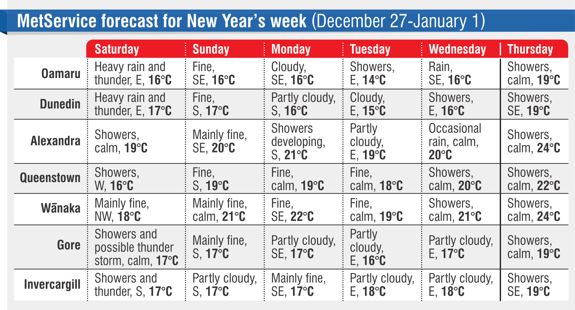 So the forecast for New Year’s Eve and New Year’s Day was for temperatures around 20°C across all the main centres in the southern regions, and rain at some stage during the two-day holiday.