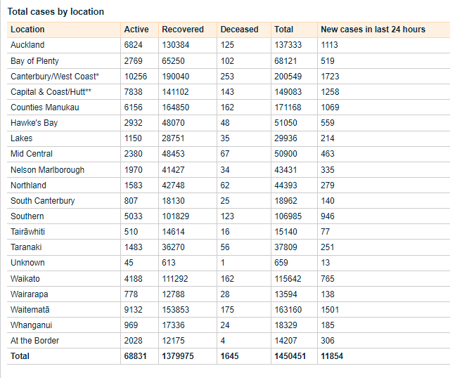 Covid-19 cases in hospital: total number 710: Northland: 16; Waitematā: 141; Counties Manukau: 59; Auckland: 85; Waikato: 58; Bay of Plenty: 36; Lakes: 9; Hawke’s Bay: 25; MidCentral: 26; Whanganui: 13; Taranaki: 13; Tairawhiti: 4; Wairarapa: 11; Capital & Coast: 37; Hutt Valley: 27; Nelson Marlborough: 16; Canterbury: 78; West Coast: 2; South Canterbury: 17; Southern: 37.