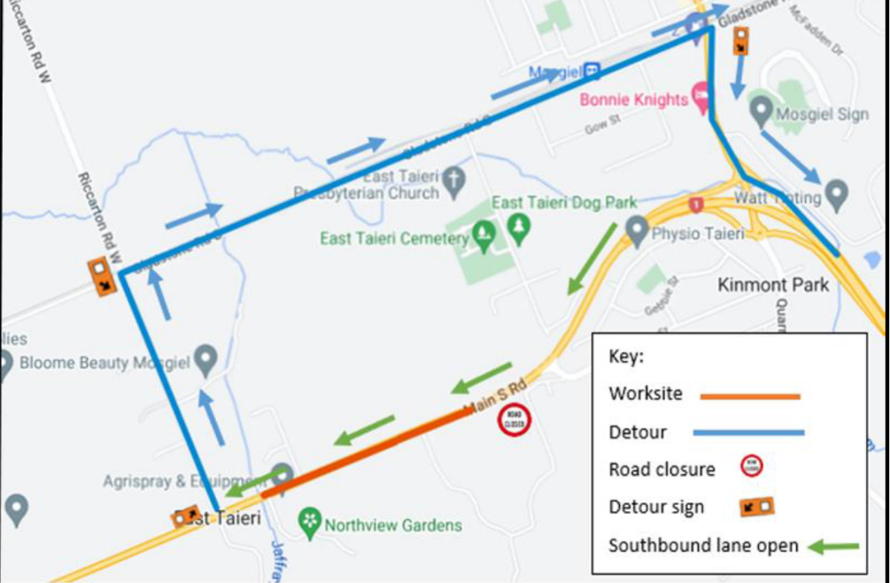 A detour between East Taieri and Kinmont Park (Mosgiel interchange) will be in place 24 hours a day as the worksite will take up half the road-width.