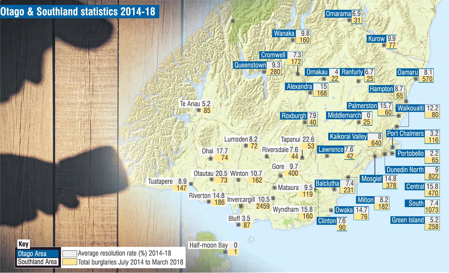 Average yearly burglary resolution rates since July 2014 were also below 5% in Stewart Island, Bluff, Portobello, Port Chalmers and Omakau.