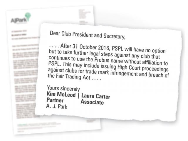 Clubs which used the Probus name and regalia but were not affiliated were threatened with legal action in a letter sent by lawyers acting for PSPL this month.
