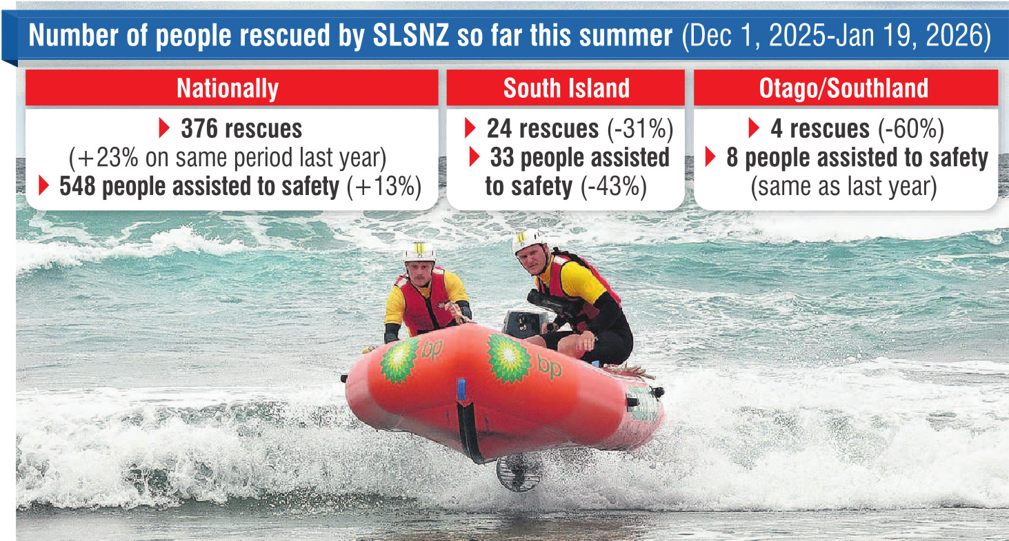However, SLSNZ Otago Southland club support lead Felix Cook said there had only been four rescues in the southern regions for the season so far (down 60% on the same period last year) and just eight people had been assisted to safety — the same as last year.