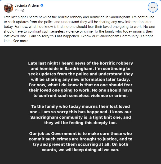 It comes as Ardern published a message on social media concerning the man’s death, saying “no one should have to confront such senseless violence or crime”.
