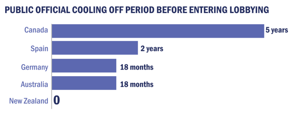 More than 75 percent of OECD, or developed countries, including Australia, Ireland, France, Canada, America and the UK, have laws requiring 'cool off' periods to stop the revolving door between government and lobbying.