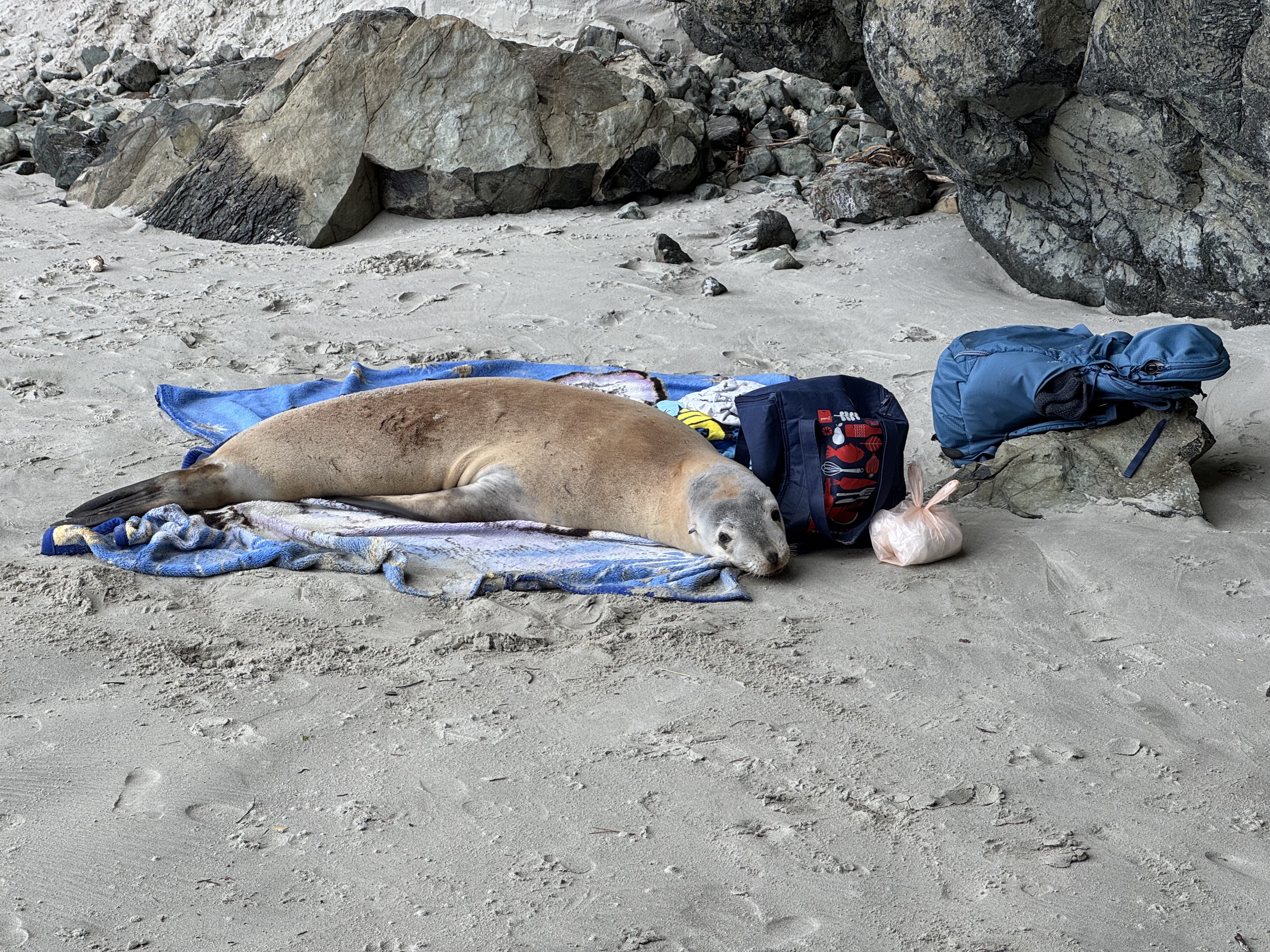 Doctors Point beach on Saturday afternoon - a sealion took over this picnic spot and had a nap on the rug for an hour before departing!- Martyn Fields