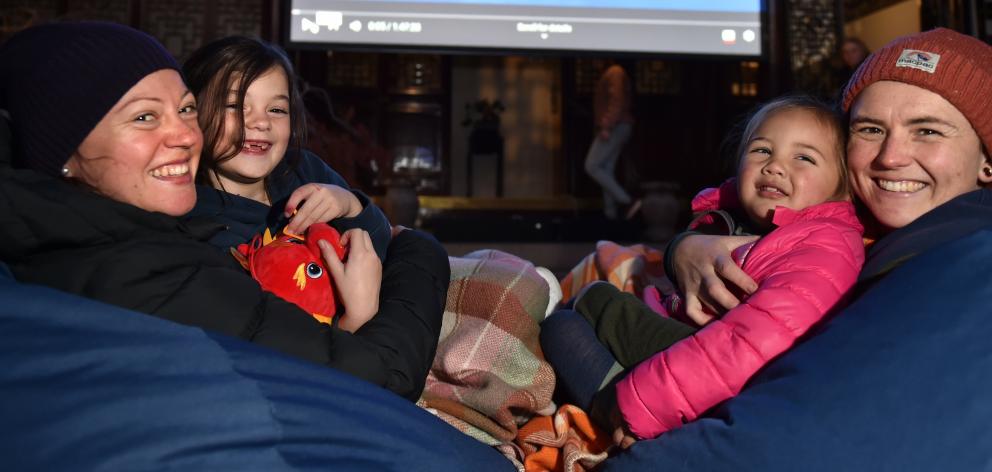 Enjoying the outdoor screening of Raya and the Last Dragon on Saturday are (below, from left) Gwen Slote, Alana Hougton, 7, Awa Kite-Bell, 2, and Madi Gyde.