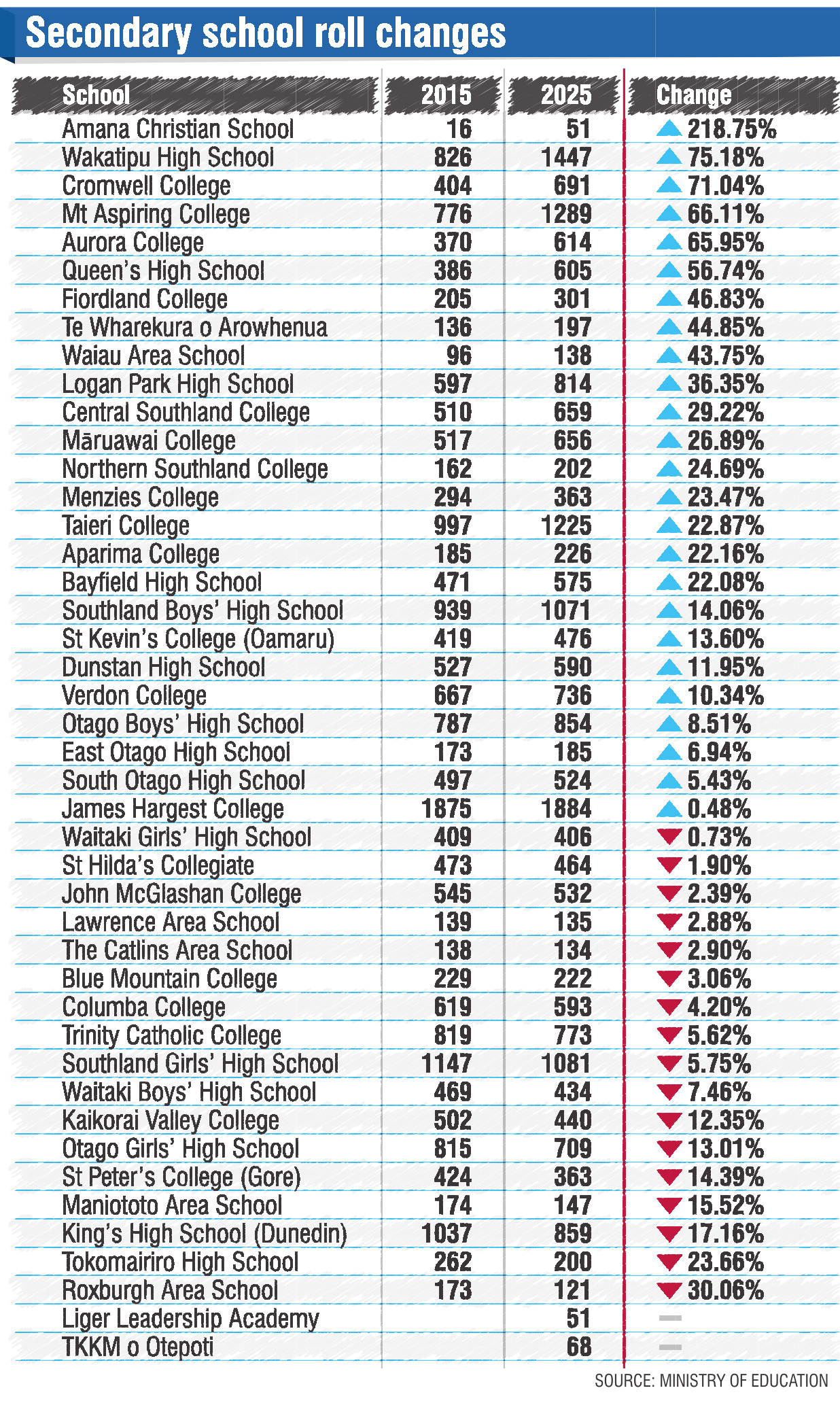 Queen’s High School had shown the most growth in Dunedin with a 57% increase in roll in the past 10 years.