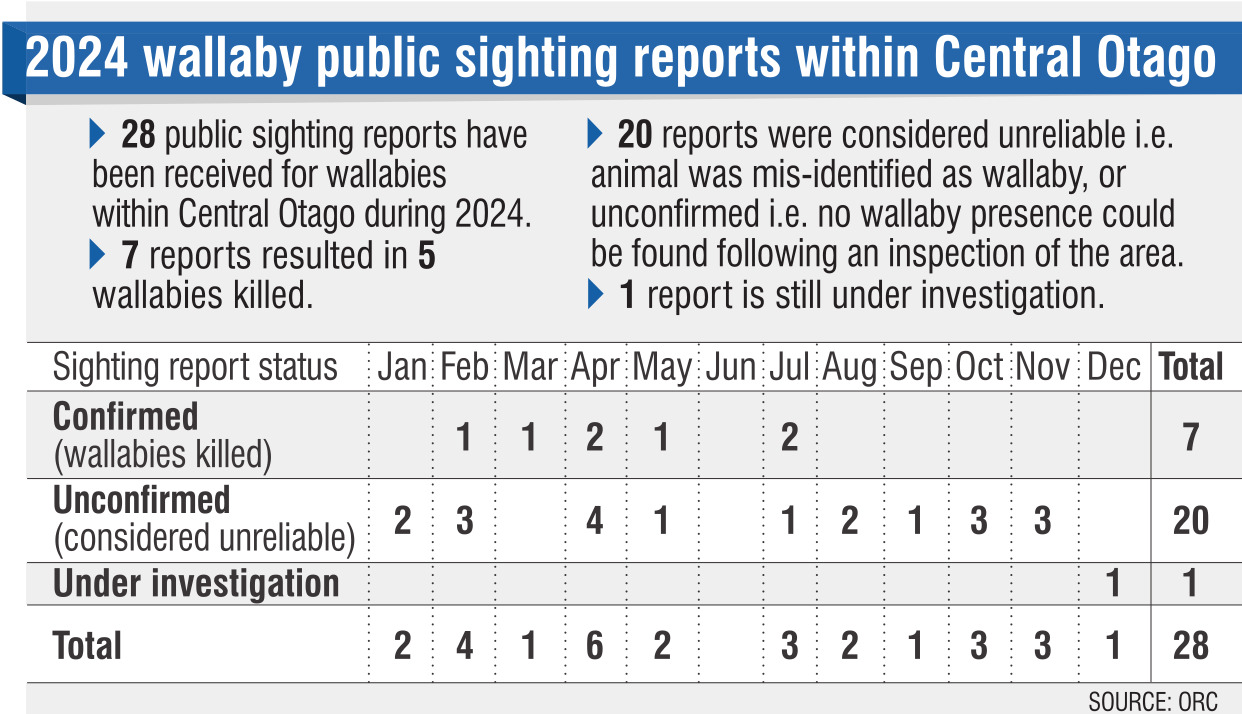 This year, the Otago Regional Council has received 28 reports of wallabies. Of those, 20 were considered "unreliable" — the animal misidentified or unable to be located after investigation.