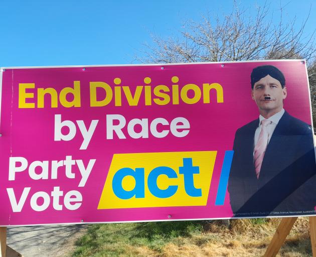 An Act New Zealand sign in Maheno was vandalised with black marker last week, turning party leader David Seymour into Adolf Hitler.