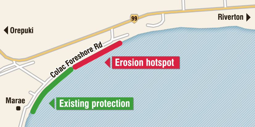The rock wall, which lines part of Colac Foreshore Rd, stops where it seems to matter most — right in front of the site.