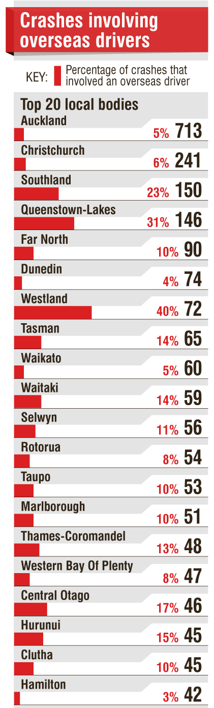 While the highest number of crashes involving foreign drivers was in Auckland, Westland and the Queenstown-Lakes region had the highest percentage of crashes involving an overseas driver.
