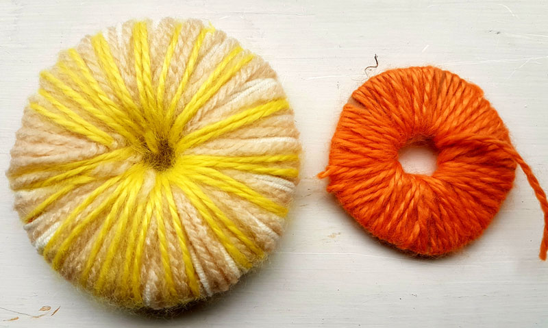 Holding the two same-sized circles together, begin to wind small amounts of different wool round the two circle.s Keep the two large together and two small together.