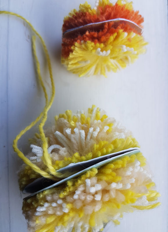 If you want a certain colour in the middle of the pom pom, this needs to be wound around first. Then add colours as you like.