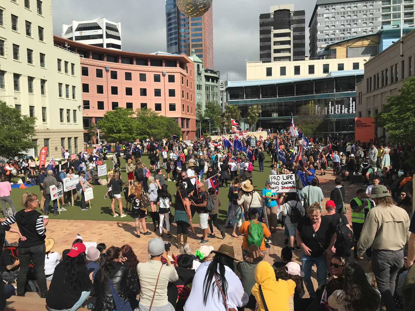 The crowds include young and old, and a diverse mix of ethnicities. Protest signs range from anti-vaccine to "Trump 2020", alongside tino rangatiratanga and United Tribes flags.